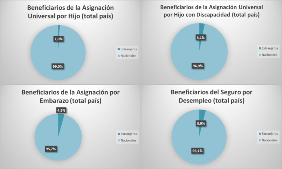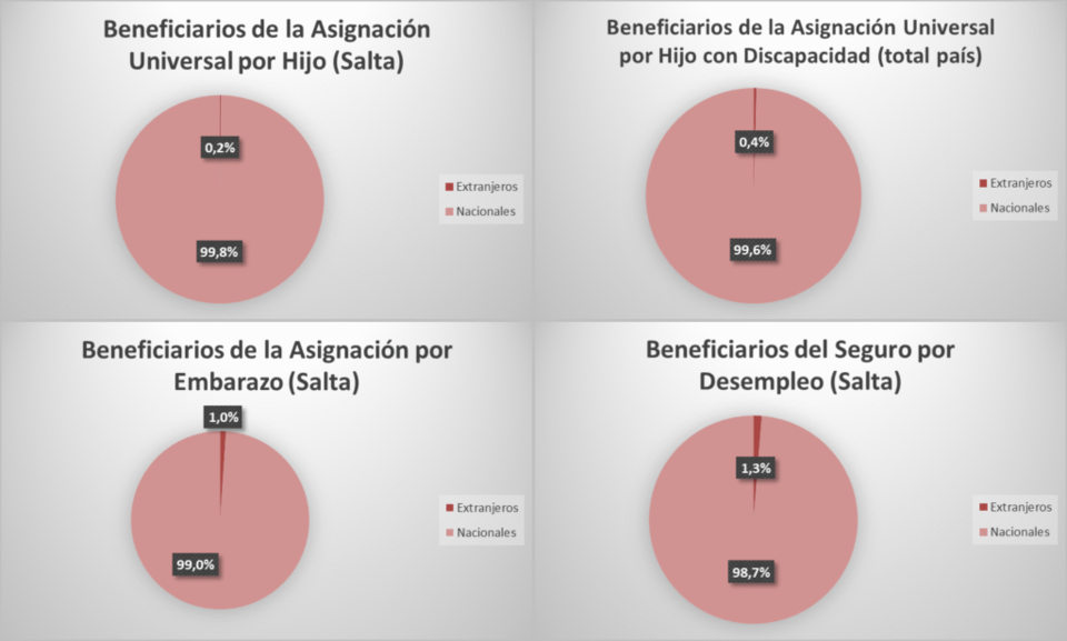 Según la respuesta al pedido de información pública, «solo hay 347 beneficiarios extranjeros de la Asignación Universal por Hijo, apenas el 0,2% de los 168.577 niños que perciben este beneficio. En el caso de la Asignación por Hijo con Discapacidad, hay solo 18 extranjeros, lo que representa un 0,4% de los 4.243 salteños que lo cobran. Las 23 mujeres extranjeras que cobran la Asignación por Embarazo solo son el 1% de las 2.198 salteñas que lo perciben. Y hay solo 54 personas con otra nacionalidad que cobran el Seguro por Desempleo sobre un total de 4.192 beneficiarios, es decir, el 1,3%».