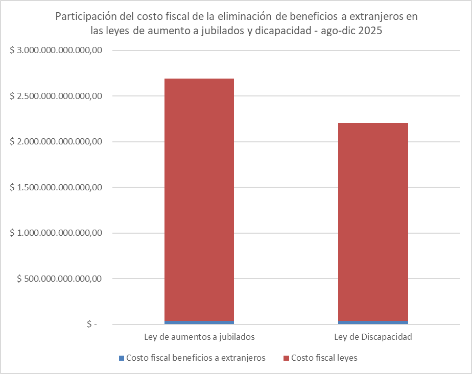 Tomando el escenario más conservador, esto habría significado un gasto de 2.174.854 millones de pesos, de los cuales la eliminación de los programas sociales a la totalidad de sus beneficiarios extranjeros habría representado apenas el 1,9%, afirma. Y concluye: «no es cierto que la eliminación de los extranjeros que cobran programas sociales represente una solución a la falta de actualización en términos reales de los haberes jubilatorios, ni a la falta de fondos para personas con discapacidad».